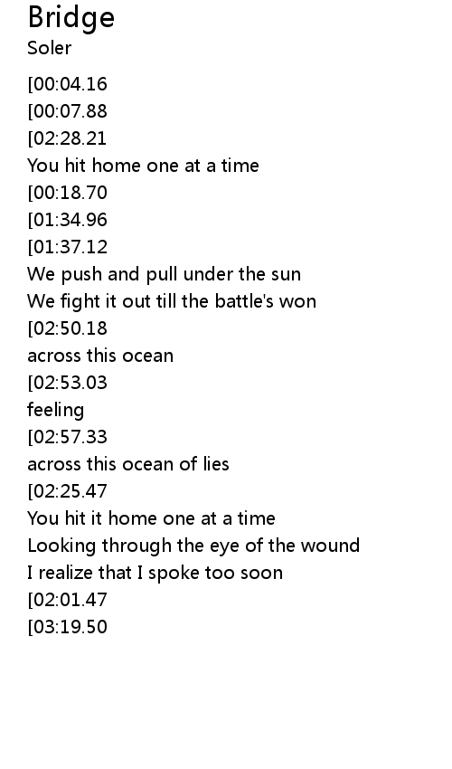 | [03:12.16][02:57.33][02:20.49][02:05.67][01:06.65][00:51.86] | Gotta build a bridge across this ocean of lies |
