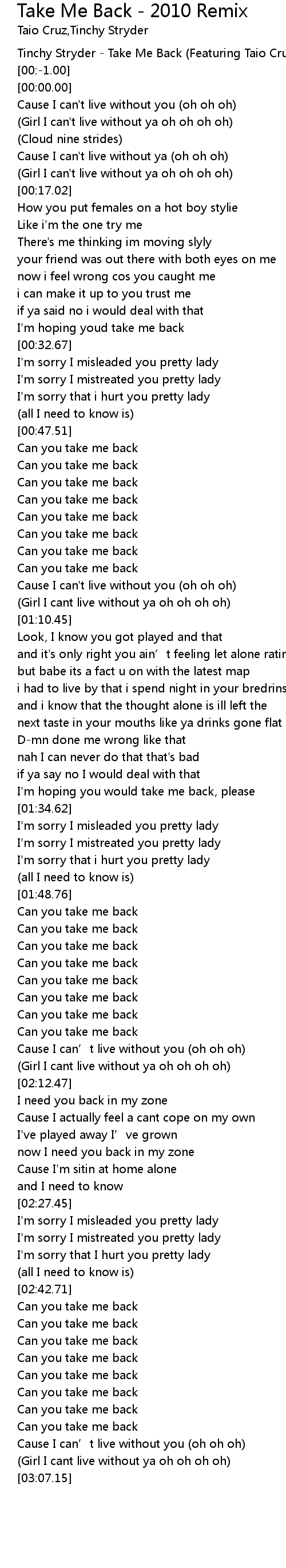 | [00:-2.00] | Tinchy Stryder Take Me Back Featuring Taio Cruz |