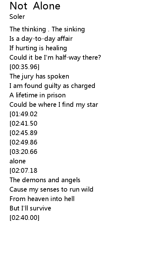 | [03:29.11][03:20.66][03:12.15][02:55.39][02:03.48][01:21.60][01:13.32] | I am not alone |