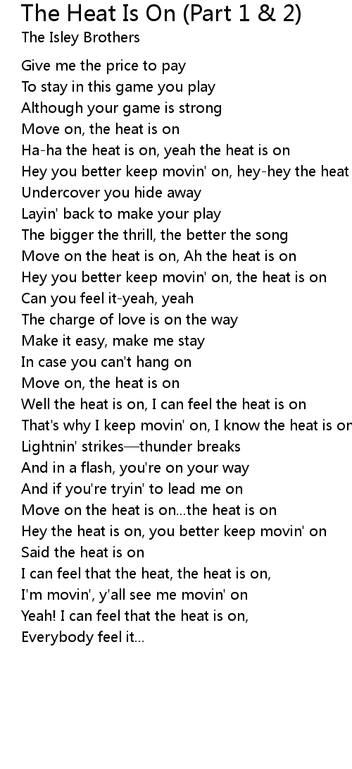 | Hey you better keep movin' on, heyhey the heat is on | |