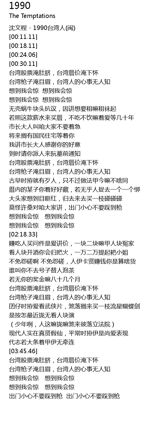 | [03:11.34] | 台湾枪子淹目眉,台湾人的心事无人知 |