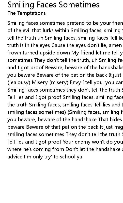 Smiling faces sometimes pretend to be your friend Smiling faces show no traces of the evil that lurks within Smiling faces, smiling faces sometimes They don't tell the truth uh Smiling faces, smiling faces Tell lies and I got proof The truth is in the eyes Cause the eyes don't lie, amen Remember a smile is just A frown turned upside down My friend let me tell you Smiling faces, smiling faces sometimes They don't tell the truth, uh Smiling faces, smiling faces Tell lies and I got proof Beware, beware of the handshake That hides the snake I'm telling you beware Beware of the pat on the back It just might hold you back Jealousy (jealousy) Misery (misery) Envy I tell you, you can't see behind smiling faces Smiling faces sometimes they don't tell the truth Smiling faces, smiling faces Tell lies and I got proof Smiling faces, smiling faces sometimes They don't tell the truth Smiling faces, smiling faces Tell lies and I got proof (Smiling faces, smiling faces sometimes) (Smiling faces, smiling faces sometimes) I'm telling you beware, beware of the handshake That hides the snake Listen to me now, beware Beware of that pat on the back It just might hold you back Smiling faces, smiling faces sometimes They don't tell the truth Smiling faces, smiling faces Tell lies and I got proof Your enemy won't do you no harm Cause you'll know where he's coming from Don't let the handshake and the smile fool ya Take my advice I'm only try' to school ya |