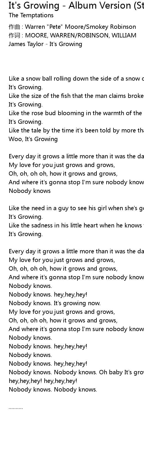 | Nobody knows. Nobody knows. Oh baby It' s growing now. | |