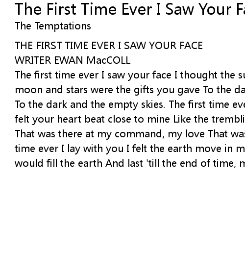 The first time ever I saw your face I thought the sun rose in your eyes And the moon and stars were the gifts you gave To the dark and the empty skies, my love, To the dark and the empty skies. The first time ever I kissed your mouth And felt your heart beat close to mine Like the trembling heart of a captive bird That was there at my command, my love That was there at my command. The first time ever I lay with you I felt the earth move in my hand I thought our joy would fill the earth And last 'till the end of time, my love, And last |