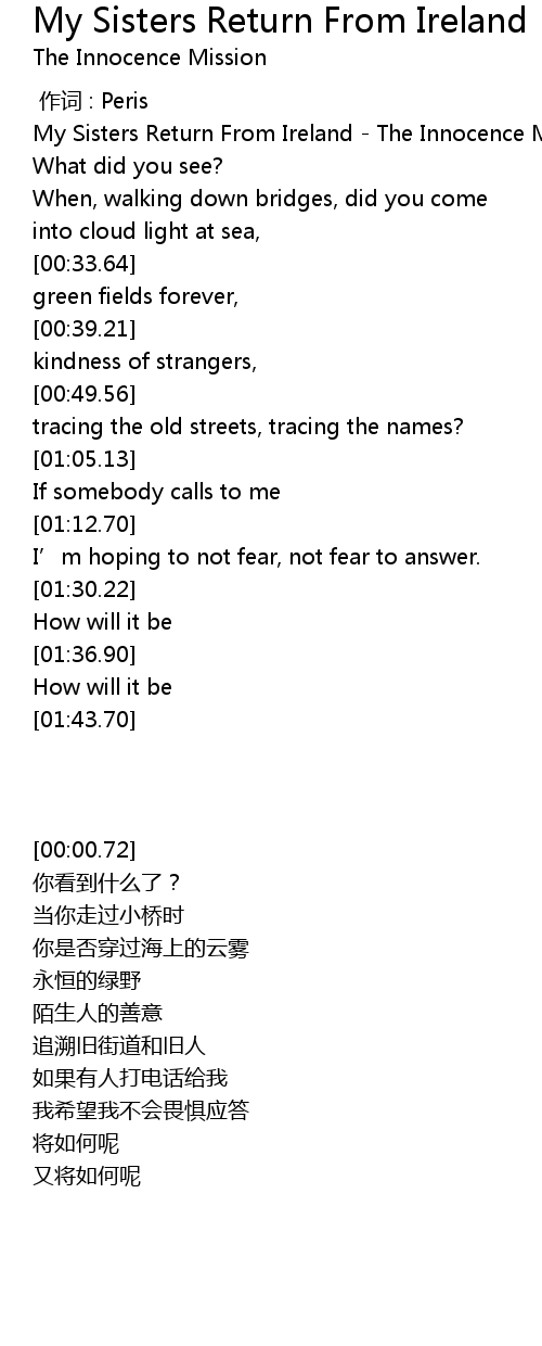 | [00:00.72] | My Sisters Return From Ireland The Innocence Mission |