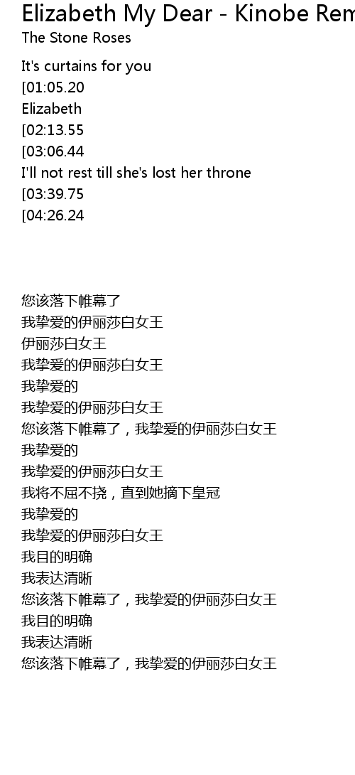 | [00:35.57][01:05.20][01:38.59][02:16.53][02:36.54] | Elizabeth my dear |