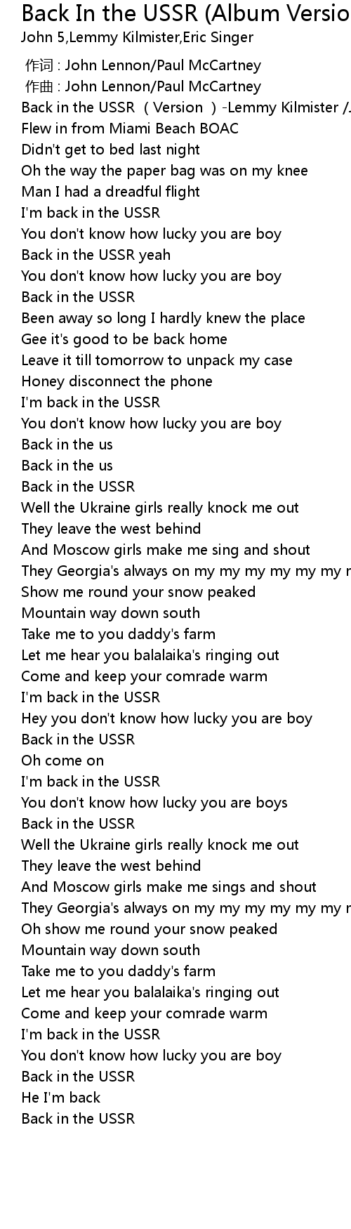 | [00:00.00] | Back in the USSR Version Lemmy Kilmister John 5 Eric Singer |