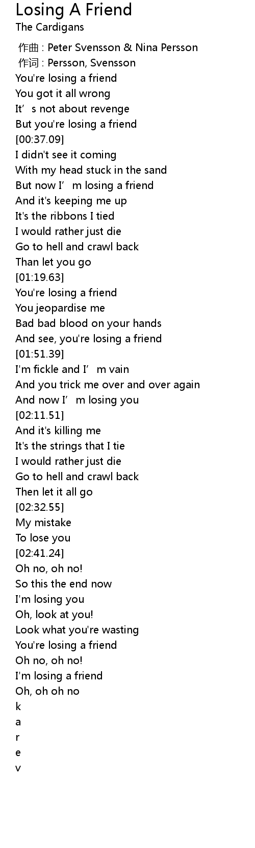 | [00:33.68] | But you' re losing a friend |