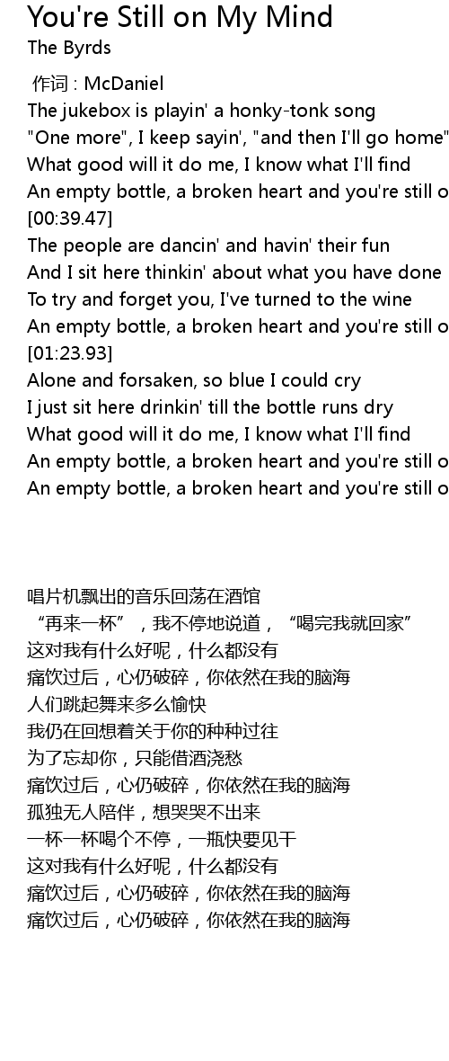 | [01:15.56] | An empty bottle, a broken heart and you' re still on my mind |