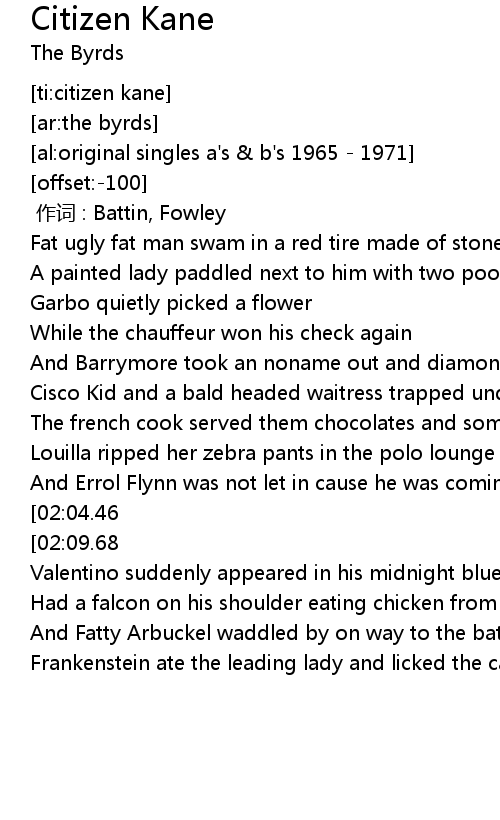 | [01:20.71][02:09.68][02:21.77] | Citizen Kane was king poor Citizen Kane |
