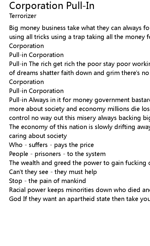 Pull-in Always in it for money government bastards are to blame no one cares any more about society and economy millions die loss of values corporation takes control no way out this misery always backing big business shit |