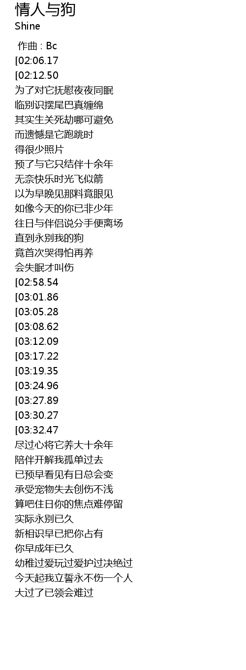 | [00:13.00][02:06.17][04:34.46] | Shine-情人与狗(粤) |