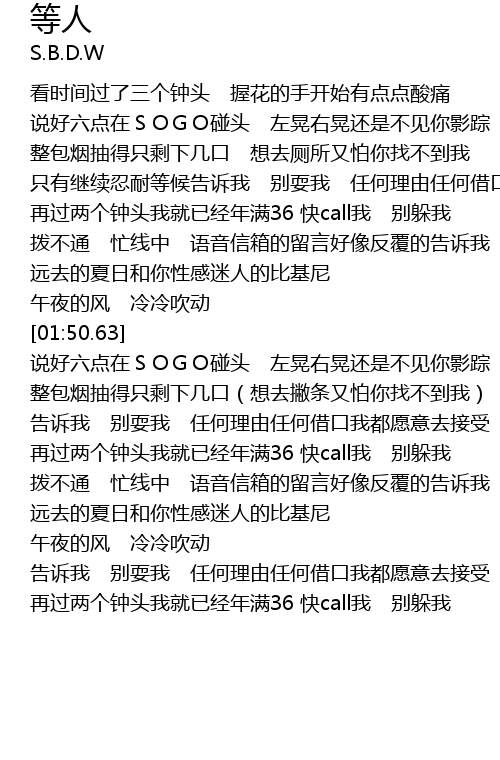 | [02:13.46] | 说好六点在SOGO碰头 左晃右晃还是不见你影踪 |