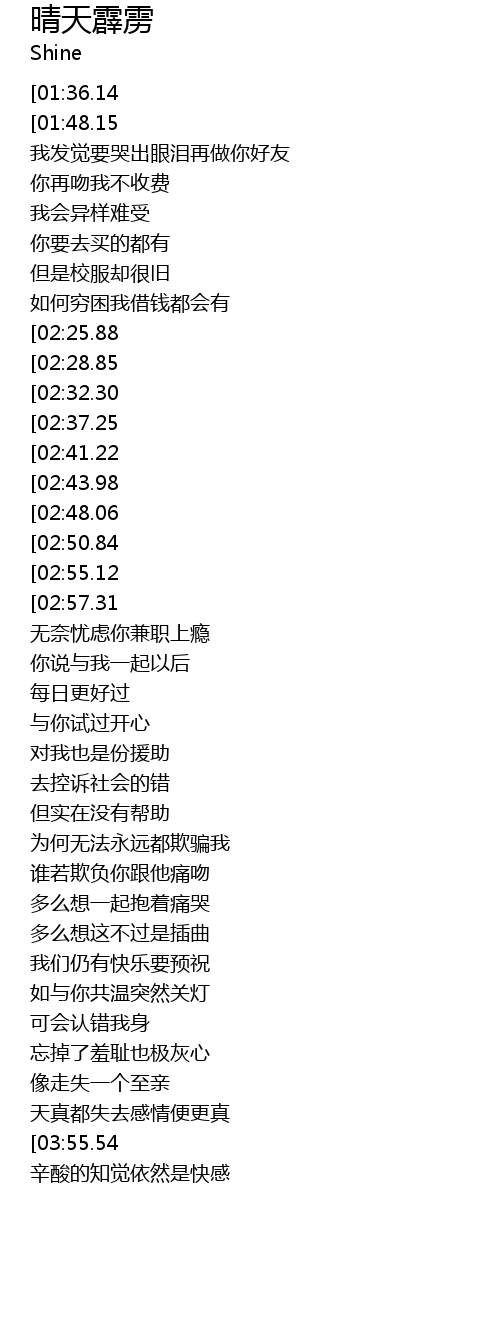 | [00:21.00][01:36.14][04:00.40] | Shine-晴天霹雳(粤) |