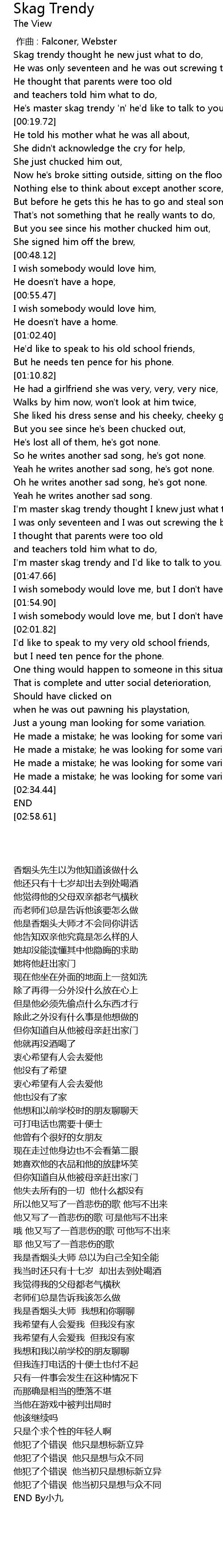 | [00:15.97] | He's master skag trendy 'n' he'd like to talk to you. |