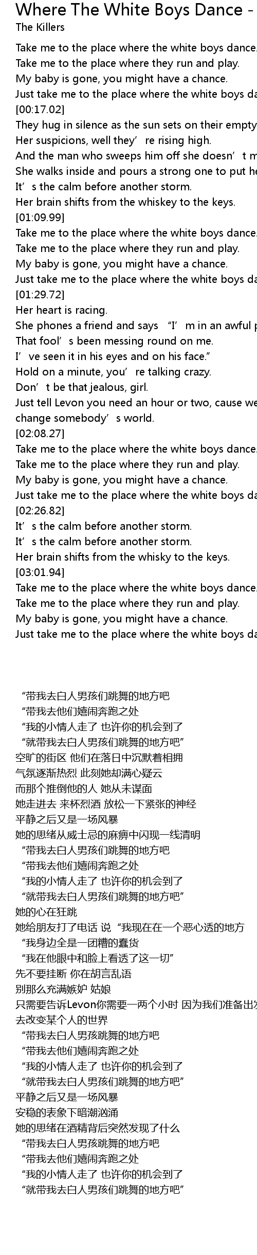 | [02:22.72] | Just take me to the place where the white boys dance. |