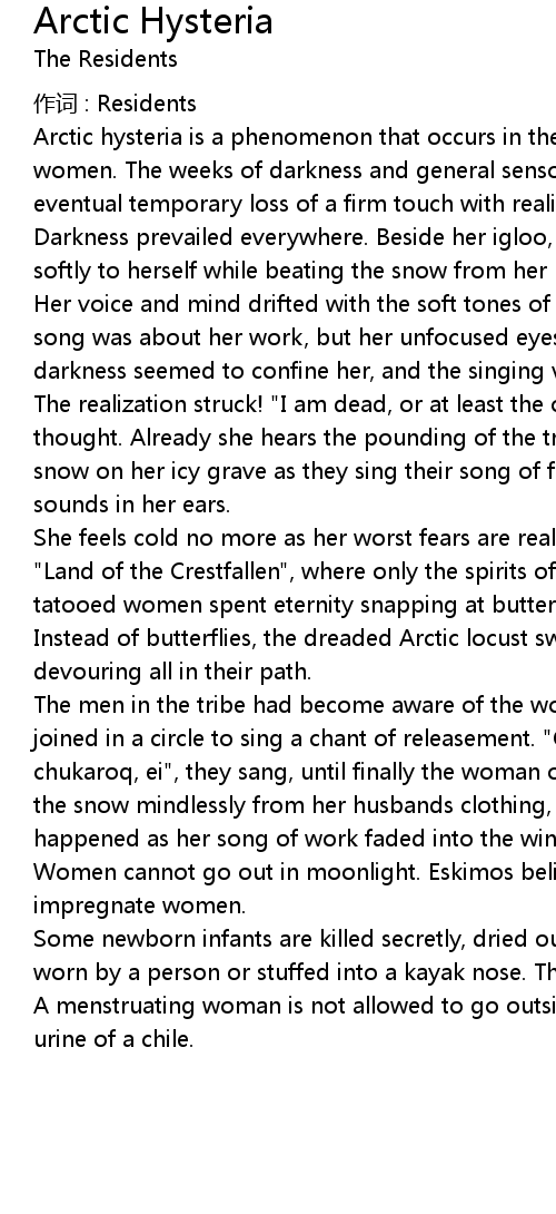 | Arctic hysteria is a phenomenon that occurs in the dead of winter,primarily to women. The weeks of darkness and general sensory deprivation lead to the eventual temporary loss of a firm touch with reality. | |