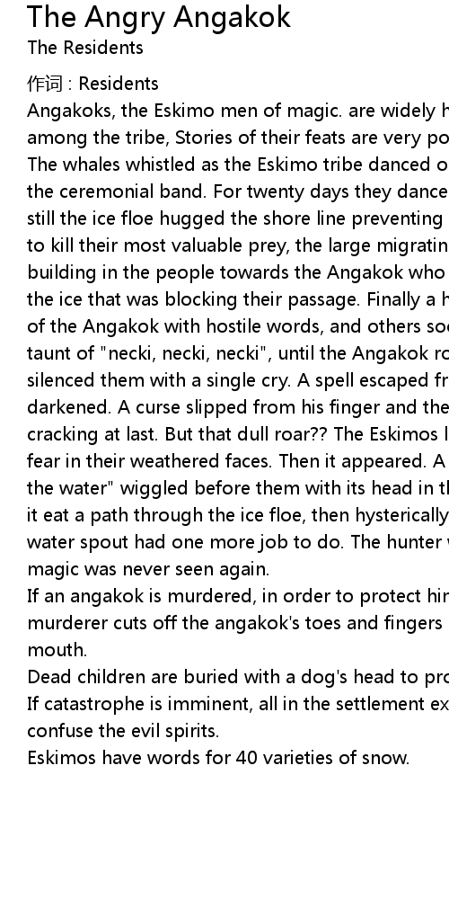 | The whales whistled as the Eskimo tribe danced on and on to the lively beatof the ceremonial band. For twenty days they danced. And sang. And prayed. And still the ice floe hugged the shore line preventing the Eskimos from being able to kill their most valuable prey, the large migrating whale. Anger had been building in the people towards the Angakok who allegedly had the power to remove the ice that was blocking their passage. Finally a hunter challenged the magic of the Angakok with hostile words, and others soon joined him in the traditional taunt of " necki, necki, necki", until the Angakok rose up before them and silenced them with a single cry. A spell escaped from his lips and the sky darkened. A curse slipped from his finger and the seas swelled. The ice was cracking at last. But that dull roar?? The Eskimos looked at one another with fear in their weathered faces. Then it appeared. A " giant snake which stands on the water" wiggled before them with its head in the clouds. They briefly watched it eat a path through the ice floe, then hysterically ran for safety. But the water spout had one more job to do. The hunter who challenged the Angakok' s magic was never seen again. | |