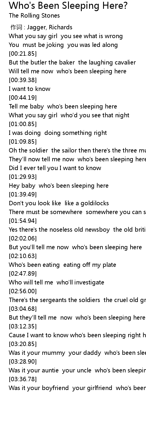 | [00:50.20] | Tell me baby who's been sleeping here |