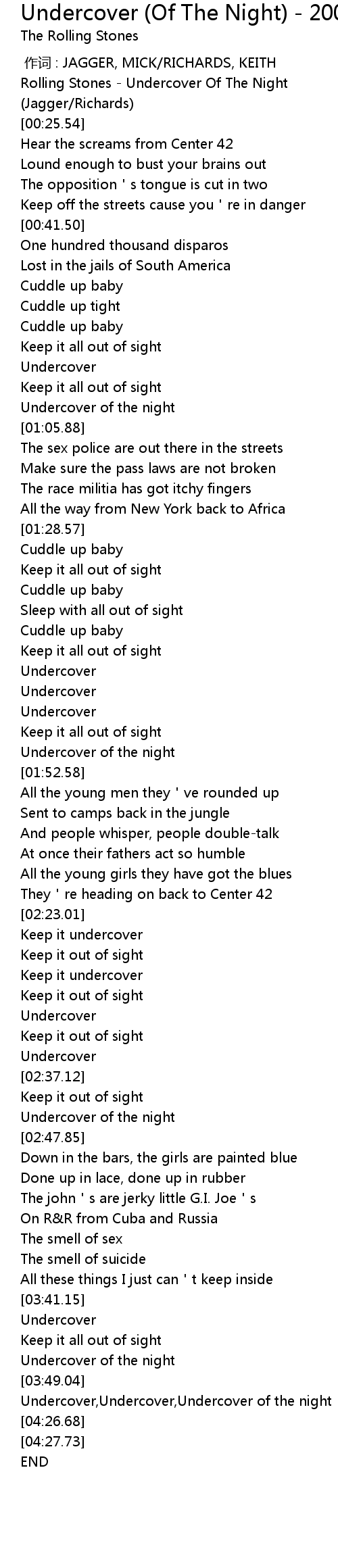| [04:20.09] | Undercover, Undercover, Undercover of the night |