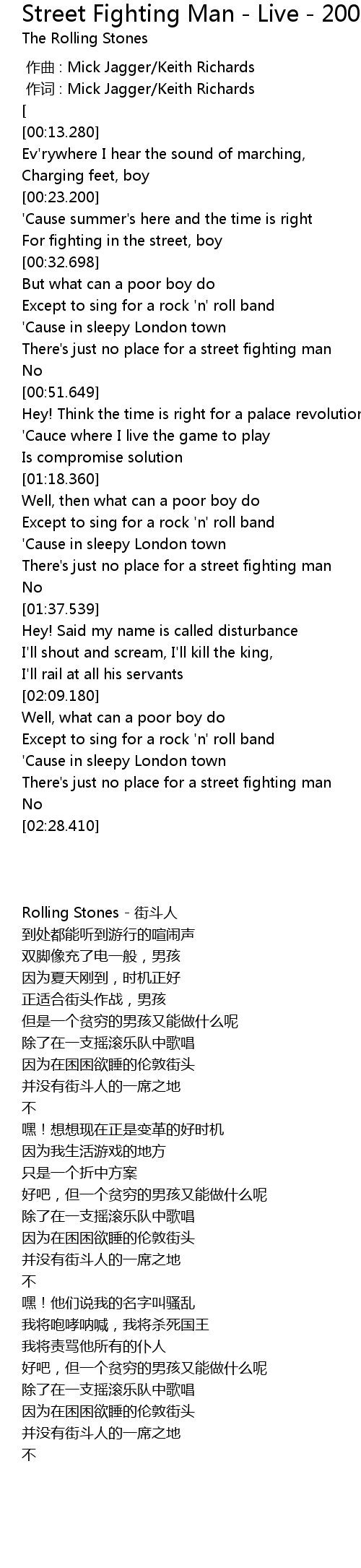 | [00:11.280][] | Rolling Stones - Street Fighting Man(M. Jagger/K. Richards) |
