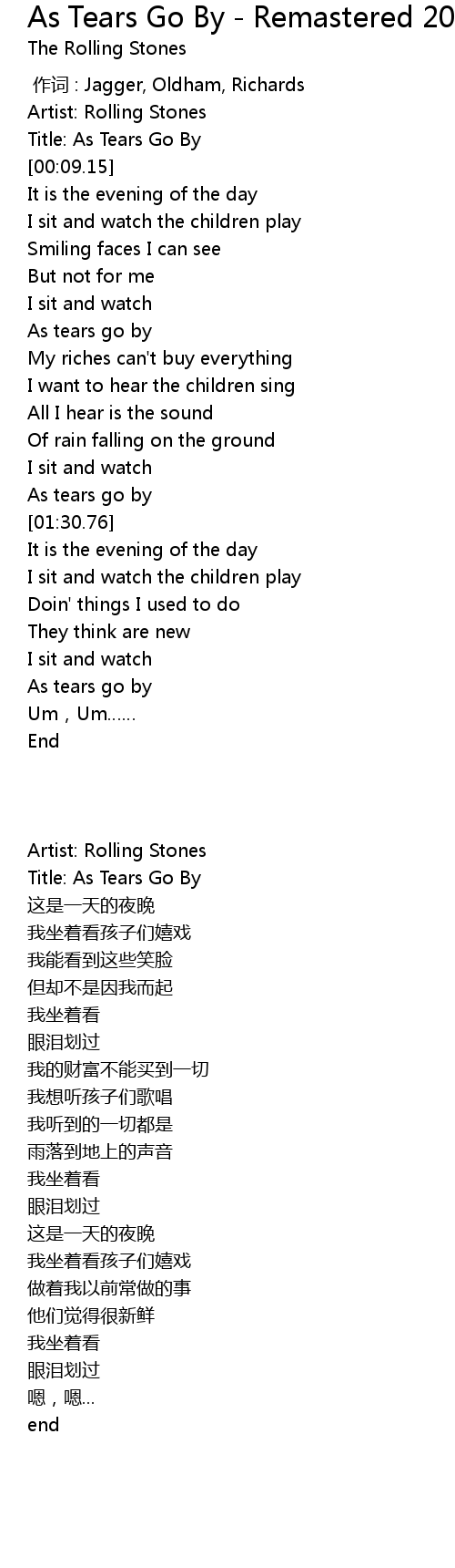 | [00:05.52] | Title: As Tears Go By |