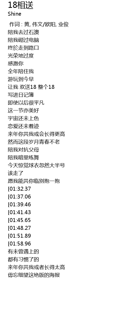 | [02:14.99][01:32.37] | 让我 欢送18 整个18 |
