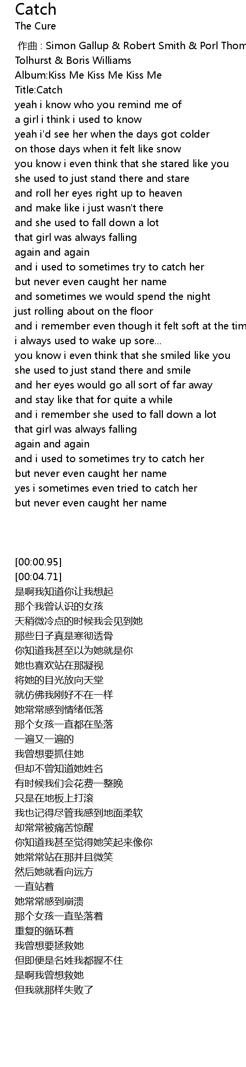 | [00:00.00] | 作曲 : Simon Gallup & Robert Smith & Porl Thompson & Laurence Tolhurst & Boris Williams |