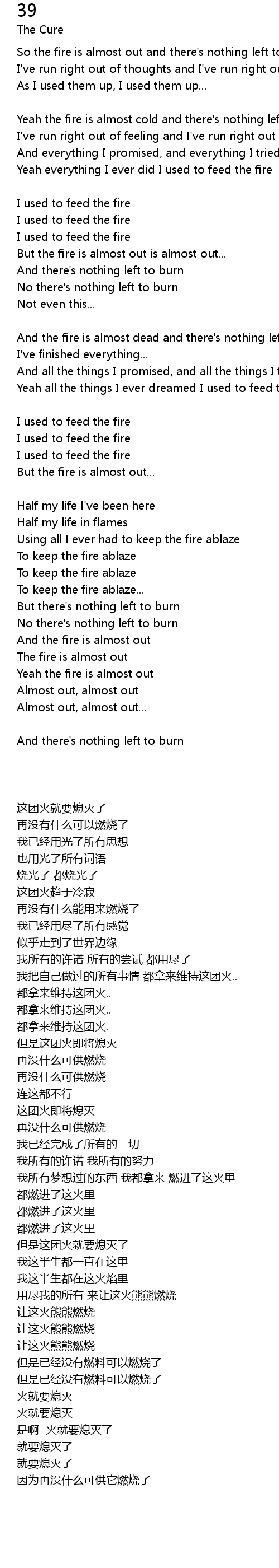 Yeah the fire is almost cold and there's nothing left to burn |