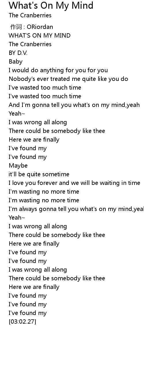 | [00:34.85] | And I'm gonna tell you what's on my mind,yeah |