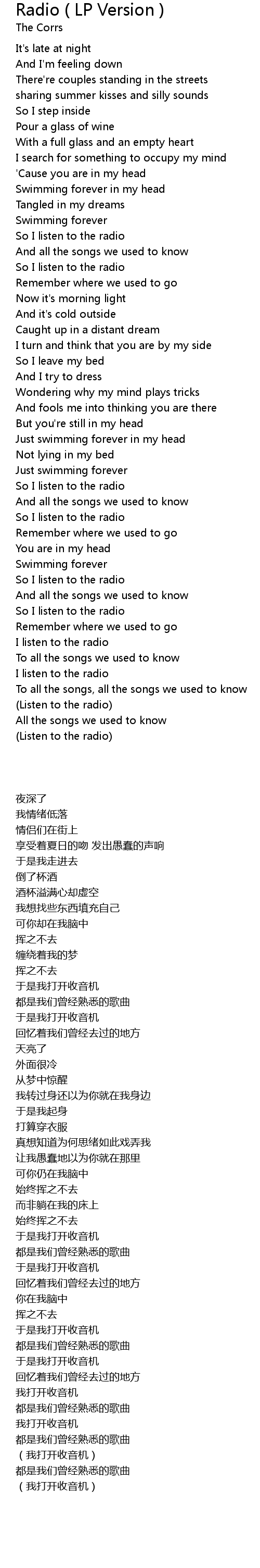 | [02:18.45] | So I listen to the radio |