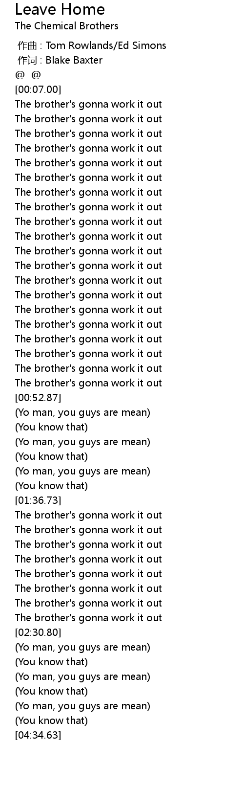 | [00:48.34] | The brother' s gonna work it out |