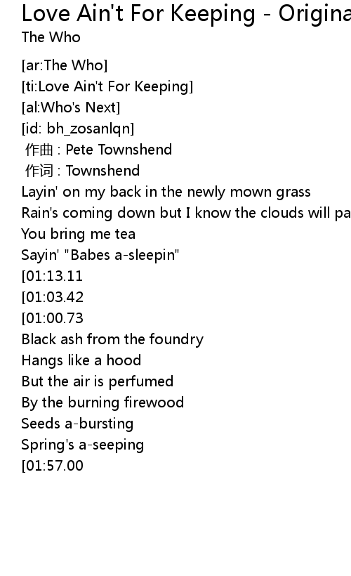 | [00:31.79][01:03.42][01:15.43][01:49.56][02:00.06] | Love ain't for keeping |