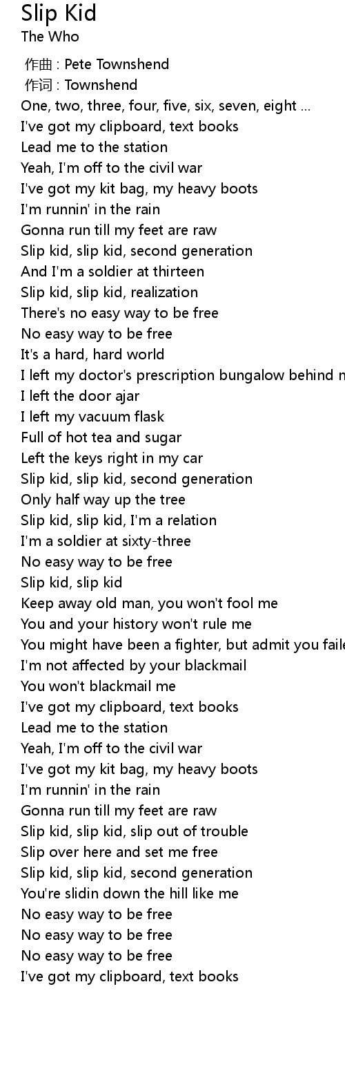 | [01:17.66] | Slip kid, slip kid, I' m a relation |