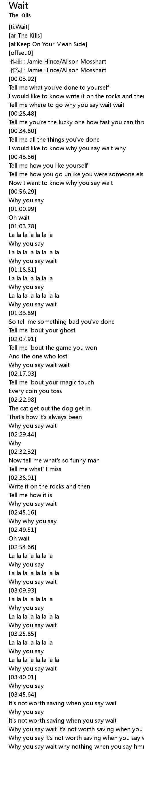 | [00:01.00] | 作词 : Jamie Hince/Alison Mosshart |