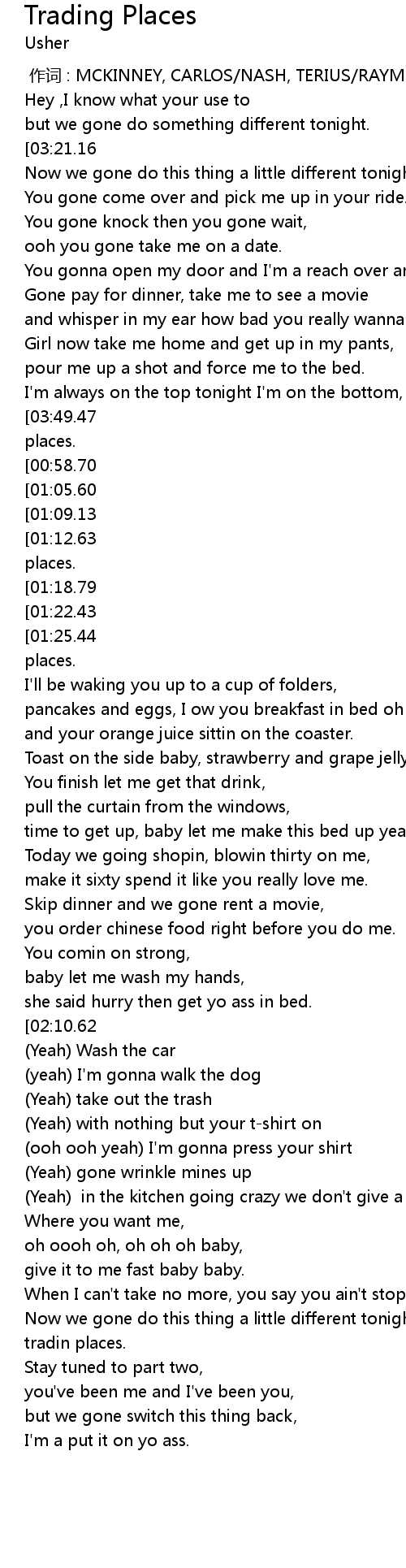 | [03:56.06][03:49.47][02:20.74][02:14.13][01:01.76][00:55.32] | cause we tradin places. |