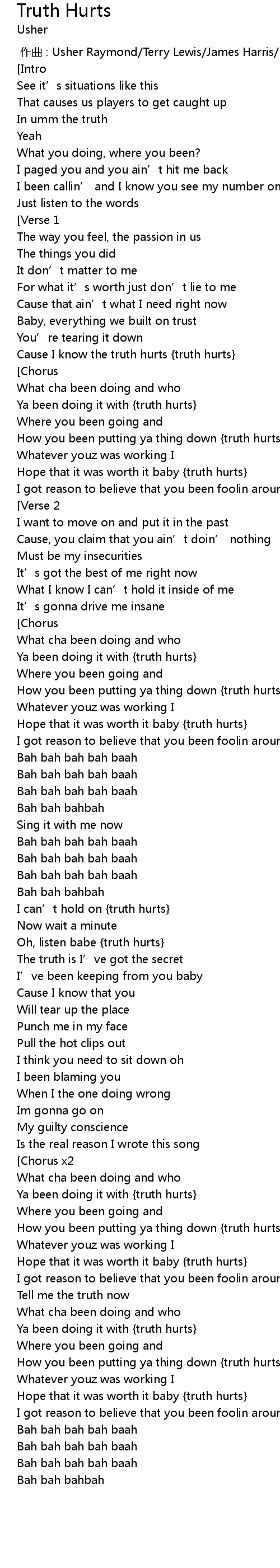 | [01:45.73] | Ya been doing it with {truth hurts} |