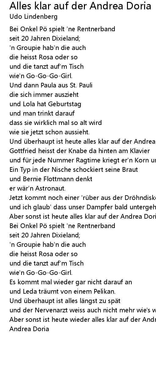 | Und ü berhaupt ist heute alles klar auf der Andrea Doria. | |