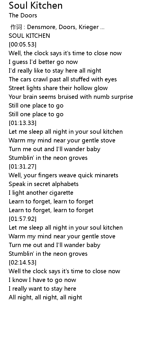 | [01:14.45] | Let me sleep all night in your soul kitchen |