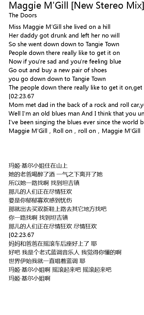 | [00:23.61] | Miss Maggie M' Gill she lived on a hill |