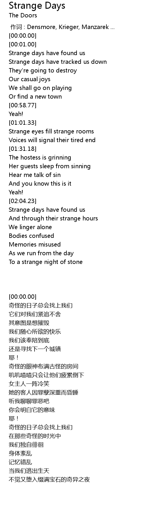 | [00:00.00] | 作词 : Densmore, Krieger, Manzarek ... |