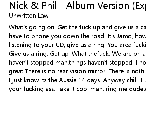 What's going on. Get the fuck up and give us a call on my mobilephone. I'm gonna have to phone you down the road. It's Jamo, howare you bro. we are just listening to your CD, give us a ring. You area fuckiing genius. I love you man. Give us a ring. Get up. What thefuck. We are on a 4 11 13 day binge. Things haven't stopped man,things haven't stopped. I hope everything's fucking going great.There is no rear vision mirror. There is nothing, it is so well beamedbut I just know its the Aussie 14 days. Anyway chill. Fucking take iteasy and I love your fucking ass. Take it cool man, ring me dude,whatever you gotta do. Rock On |