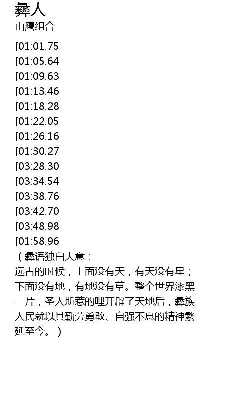 | [03:59.40][03:28.30][01:34.17] | 我是一个彝人,噢…… |