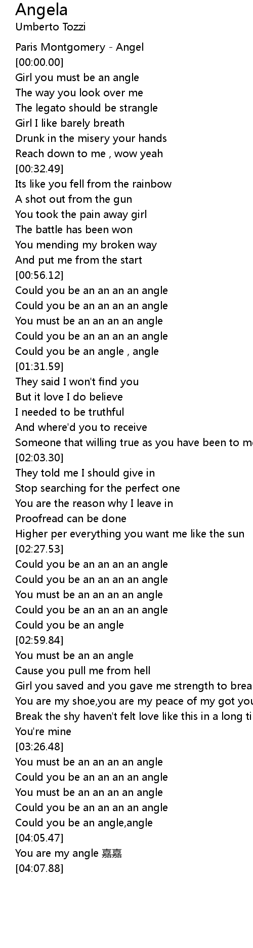 | [01:22.70] | Could you be an angle , angle |