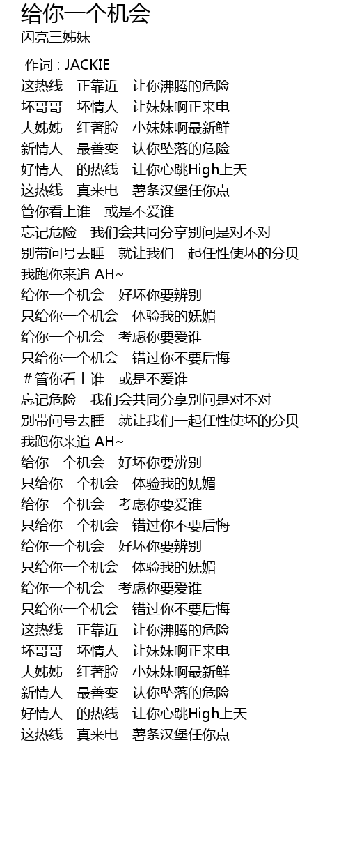 | [02:34.59] | zhǐ gěi nǐ yí gè jī huì cuò guò nǐ bú yào hòu huǐ |