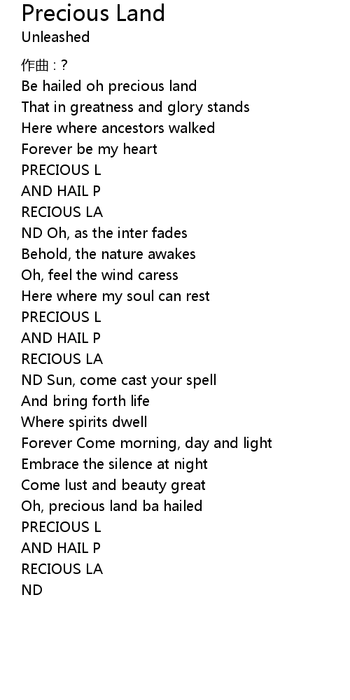 | Be hailed oh precious land | |