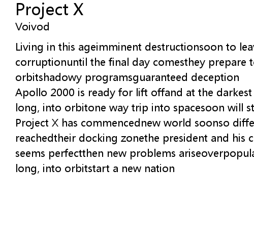 | Project X has commencednew world soonso different, so differentfinally have reachedtheir docking zonethe president and his crewfind a new homeeverything seems perfectthen new problems ariseoverpopulationstarts when they multiplyso long, into orbitstart a new nation |