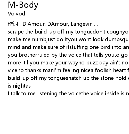 | scrape the build-up off my tonguedon't coughyou'll hurt my lungmake me high and make me numbjust do ityou wont look dumbsquare into a circle make it fitnever mind and make sure of itstuffing one bird into anotheri'm way over herei'm with you brotherruled by the voice that tells youto go on and destroy those cellskill more 'til you make your wayno buzz day ain't no daychop a breathing hole in my viceno thanks mani'm feeling nicea foolish heart forever youngscrape the build-up off my tonguesnatch up the stone hold on tight'til night is day and day is nightas | |