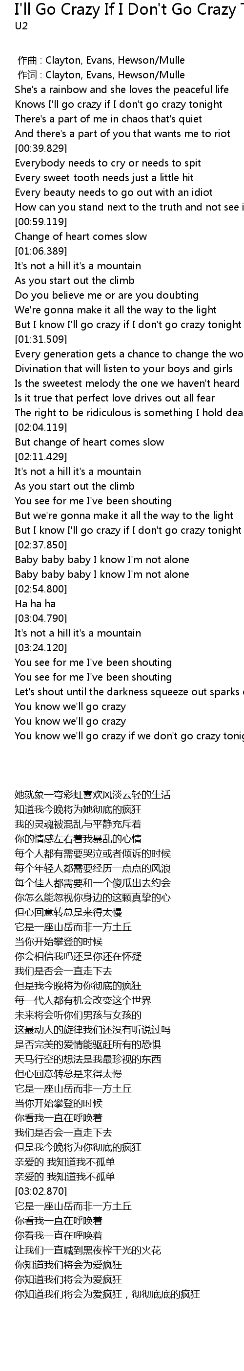 | [02:31.120] | But I know I' ll go crazy if I don' t go crazy tonight |