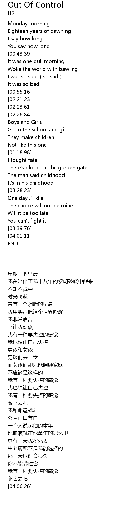 | [03:41.00][02:21.23][01:20.65][00:56.44] | I was of a feeling it was out of control |